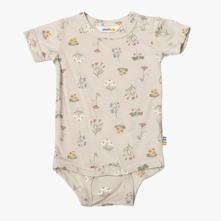 Body med korte ermer. Trykkknapper på den ene skulderen og mellom bena. En utrolig myk kvalitet basert på 100% økologisk bambus som er fantastisk behagelig å ha på. Søt trykk. Øko-tex 100 etikett.