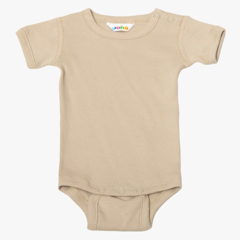 Body med korte ermer og trykkknapper på den ene skulderen og mellom bena. En deilig myk og elastisk økologisk bomullskvalitet med fin struktur som er fin å bruke inni. Øko-tex 100 etikett.