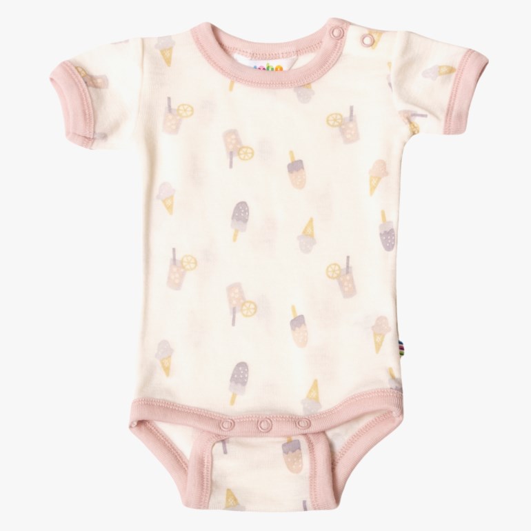 Body med korte ermer. Trykknapper på den ene skulderen og mellom bena for lettere påkledning. En ribbet, myk og lett ullkvalitet med god strekkbarhet som er fin og behagelig å bruke på innsiden. Søtt trykk med kontrasterende kanter. Ren merinoull og merket Oeko-tex 100.