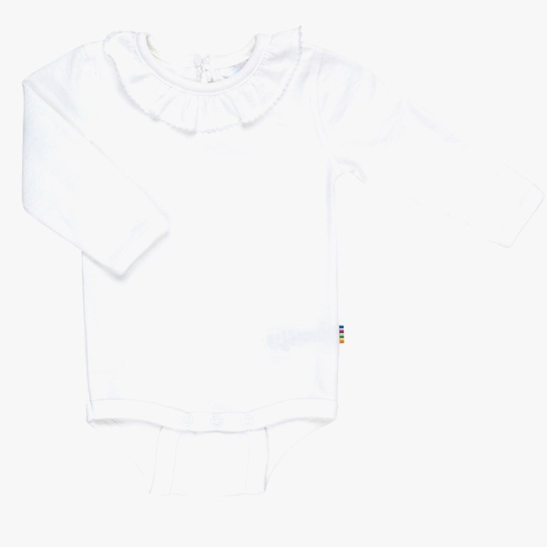 Body med lange ermer. Dekorativ krage med piquettesøm som en søt detalj. Trykkknapper mellom bena og en knapp i nakken for enklere påkledning. En myk og lett økologisk bomullspiké med god strekkbarhet og glatt rygg. Ensfarget. Øko-tex 100 etikett.