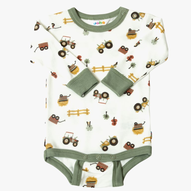 Body med lange ermer. Trykknapper på den ene skulderen og mellom beina. En deilig, myk viskosekvalitet basert på 100% organisk bambus med en glatt overflate som er veldig fin å ha på. Søtt trykk med kontrastsøm og kanter. Merket øko-tex100.