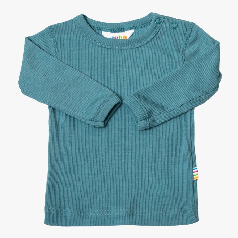 Ensfarget, ribbestrikket og langermet genser med trykknapper på skulder opp til størrelse 90. Laget i en ekstra fin ullkvalitet med silke. Myk og med et litt skinnende uttrykk.