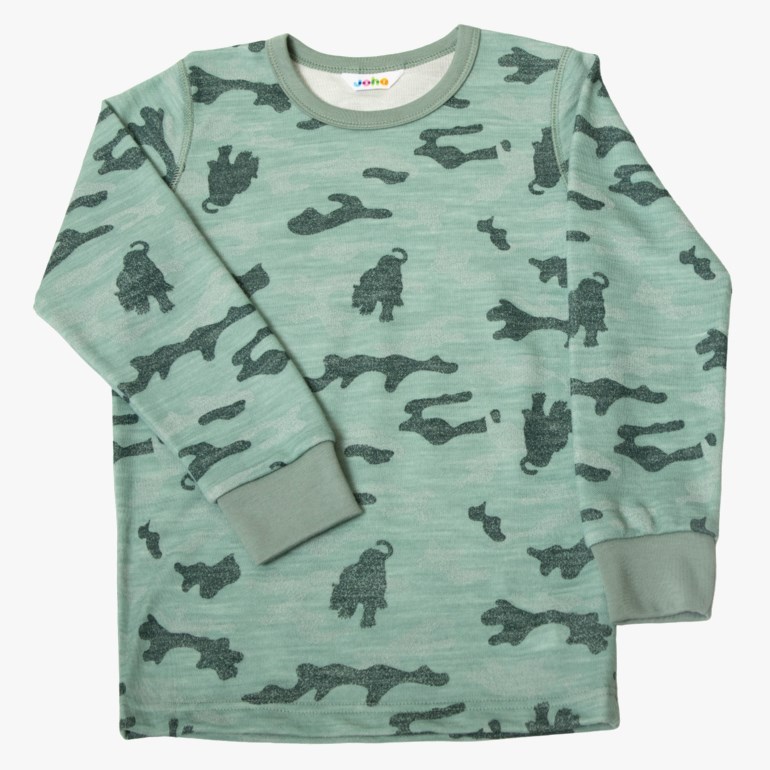 Bluse med lange ermer. En deilig myk og elastisk kvalitet, hvor ullens unike egenskaper er på utsiden og myk økologisk bambus på innsiden. Spesielt egnet for svært sensitiv hud. Fint trykk med matchende kanter. Ullrik blanding og Øko-tex 100 etikett.