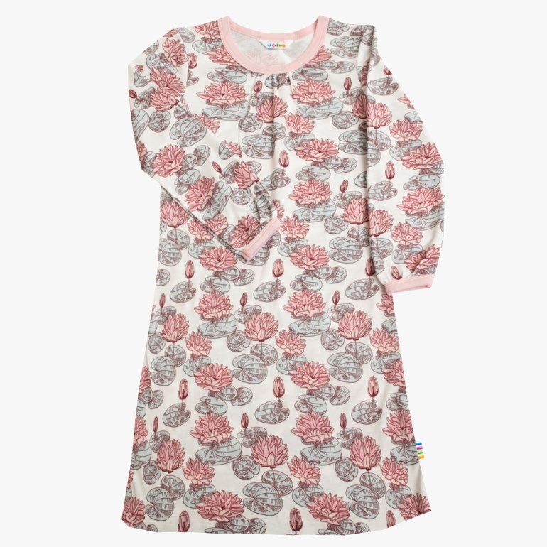 Nattkjole med lange ermer. Rynkeeffekt ved halsen og håndledd som søt detalje. En utrolig myk kvalitet baseret på 100 prosent økologisk bambus som er deilig behagelig å ha på. Fint print med ensfargede kanter. Oeko tex 100 merket.
