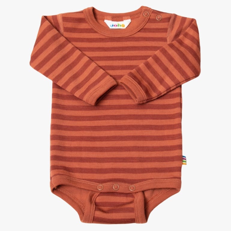 Stripete body med lange ermer, laget i en fin, glatt og elastisk ullkvalitet som er deilig og myk og behagelig å ha på. Kommer med trykknapper på den ene skulderen og mellom beina for enkel påkledning.