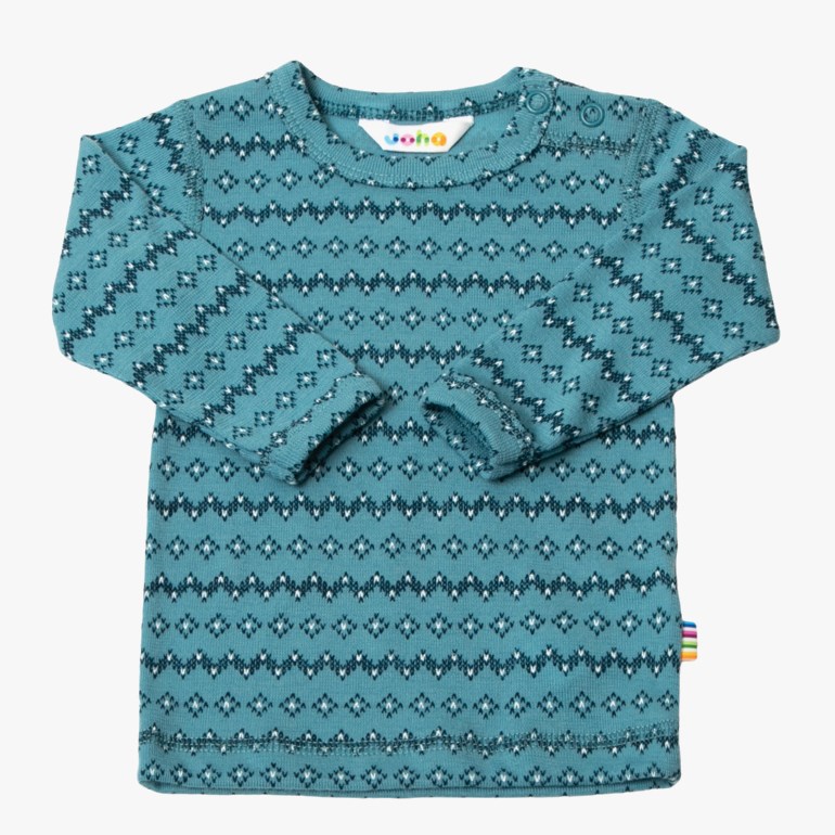 Genser med lange ermer. Str. 60-90 har trykknapper på den ene skulderen for enklere påkledning av de minste. En ribbet, myk og lett ullkvalitet med god strekkbarhet som er fin og behagelig å ha på. Søtt trykk. Ren merinoull og Oeko-tex 100-merket. 100% Marinoull.