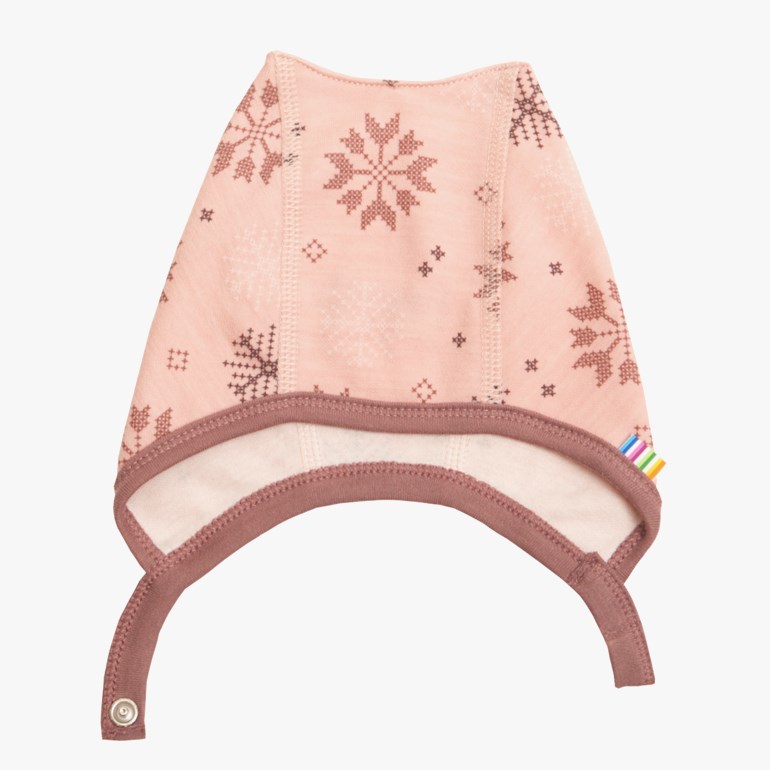 Lue med trykknapp og enkelt lag. Søt fasong med god passform. En ekstra lekker kvalitet hvor ullens unike egenskaper er på yttersiden og myk økologisk bomull på innsiden. Særdeles velegnet for meget følsom hud. Søtt print med kontrastfargede kanter. Wool rich blend og Oeko-tex 100 merket.
