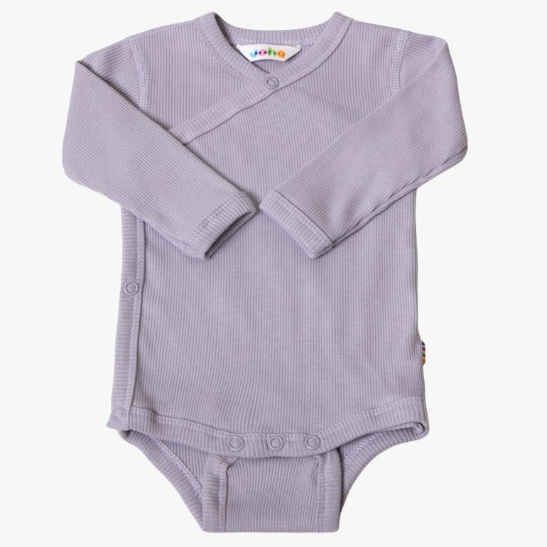 Omslagsbody med lange ermer fra Joha, med trykknapper mellom beina og skrått over magen for lettere påkledning. En deilig myk og elastisk, økologisk bomullskvalitet med en fin struktur som er fin å bruke på innsiden. Merket øko-tex100.