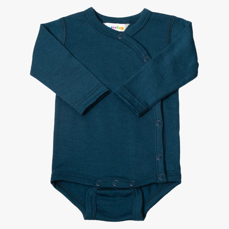 Ensfarget body med sidelukking, ekstra praktisk for de aller minste. Lukkes med knapper diagonalt over magen og mellom bena for enklere påkledning. Bodyen er laget i en deilig, supermyk og lett ullkvalitet med god strekkbarhet som er fin og behagelig å ha på.