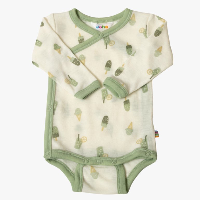 Omslagsbody med lange ermer. Trykk knapper mellom bena og skrått over magen for lettere påkledning. En myk og lett ullkvalitet med god strekkbarhet som er fin og behagelig å bruke på innsiden. Søtt trykk med kontrasterende kanter. Ren merinoull og merket Oeko-tex 100.