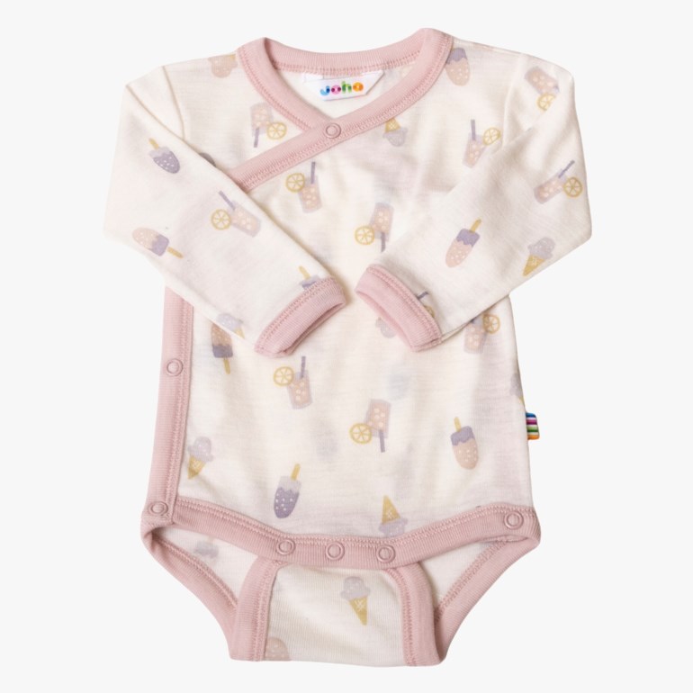 Omslagsbody med lange ermer. Trykk knapper mellom bena og skrått over magen for lettere påkledning. En myk og lett ullkvalitet med god strekkbarhet som er fin og behagelig å bruke på innsiden. Søtt trykk med kontrasterende kanter. Ren merinoull og merket Oeko-tex 100.