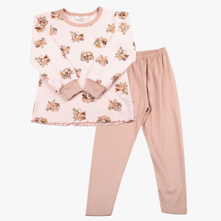 Pysjamassett. Bluse med lange ermer og en bedårende dekorativ kant i halsen. Bukser med god strikk i midjen. Hele settet er laget av en virkelig myk og elastisk økologisk bomullskvalitet som er veldig behagelig å ha på. Søt print med kontrastfargede kanter og ensfargede bukser. Øko-tex 100 etikett.