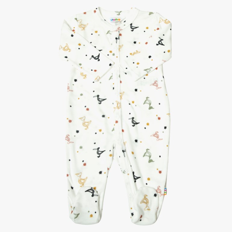 Heldress med fot. Trykknapper foran og ned langs det ene benet for lettere påkledning. Myk kvalitet basert på 100% organisk bambus som er fin og behagelig mot huden. Søtt trykk og merket øko-tex100.