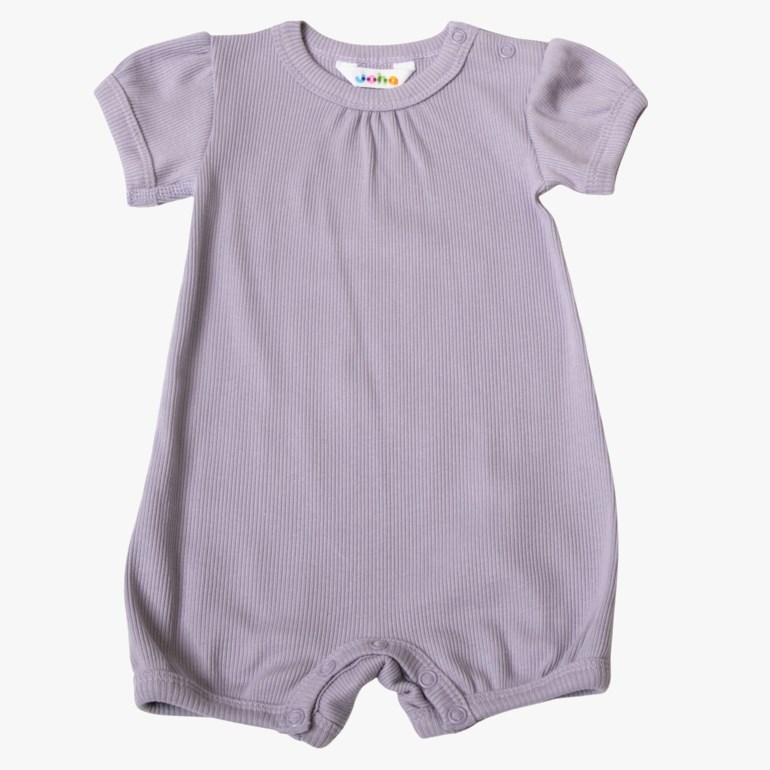 Sommerdress med korte ermer og ben. Søte puffermer og rynkeeffekt i nakken og i beina som søte detaljer. Trykknapp på den ene skulderen og mellom bena for lettere påkledning. En deilig myk og elastisk økologisk bomullskvalitet med en fin struktur som er fin å ha på. Oeko-tex 100 merke.
