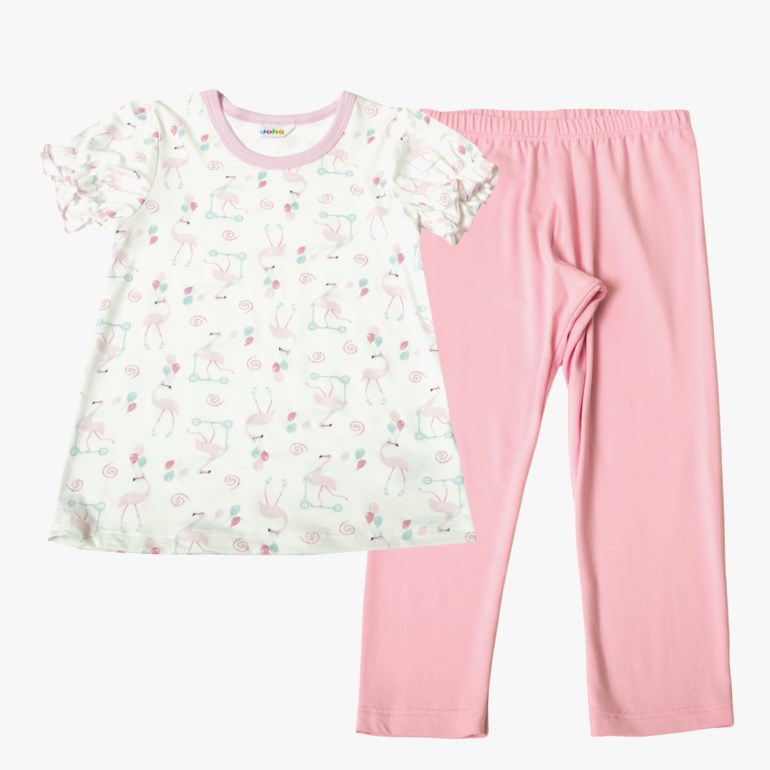 Pyjamassett. Bluse med korte ermer og A-form. Søtt trykk med glitter og ensfargede kanter. Ensfargede leggings med 3/4 lengde. God strikk i livet. Hele settet er i en ekstra myk og deilig kvalitet basert på organisk bambus. Strekkbarheten og mykheten i kvaliteten gjør den fin og behagelig å ha på. Perfekt sett for varme sommer netter. Oeko-tex 100 merke.