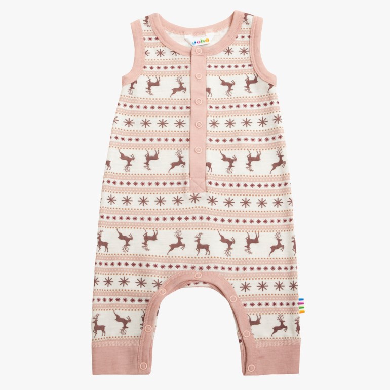 Sparkebukse uten fot med trykknapper i stolpelukning samt mellom benene. En pen, glatt og elastisk ullkvalitet som er deilig myk og behagelig å ha på. Søtt print med ensfargede kanter. Wool rich blend og Oeko tex 100 merket.