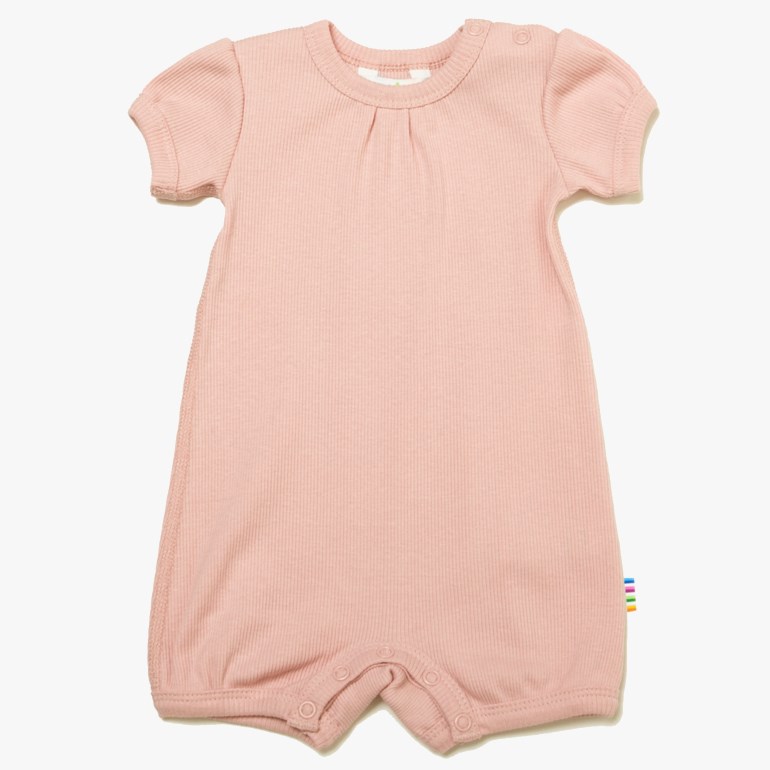Sommerdress med korte ermer og ben. Søte puffermer og rynkeeffekt ved halsen og i bena som søt detaljer. Trykknapp på ene skulder og mellom bena for en lettere påkledning. En lekker myk og elastisk økologisk bomullskvalitet med flott struktur som er deilig å ha på. Oeko-tex 100 merket.
