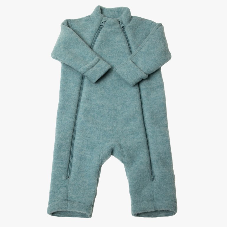 Heldress med 2 i 1 folder ved hender og føtter. Dobbel glidelås foran for enklere av/på kledning. En tyngre børstet ullkvalitet som er ekstra myk og deilig. Dressen er perfekt å bruke i barnevognen eller bilsetet. Fin melert farge. Ren merinoull og Oeko-tex 100-merket. 100% ull.
