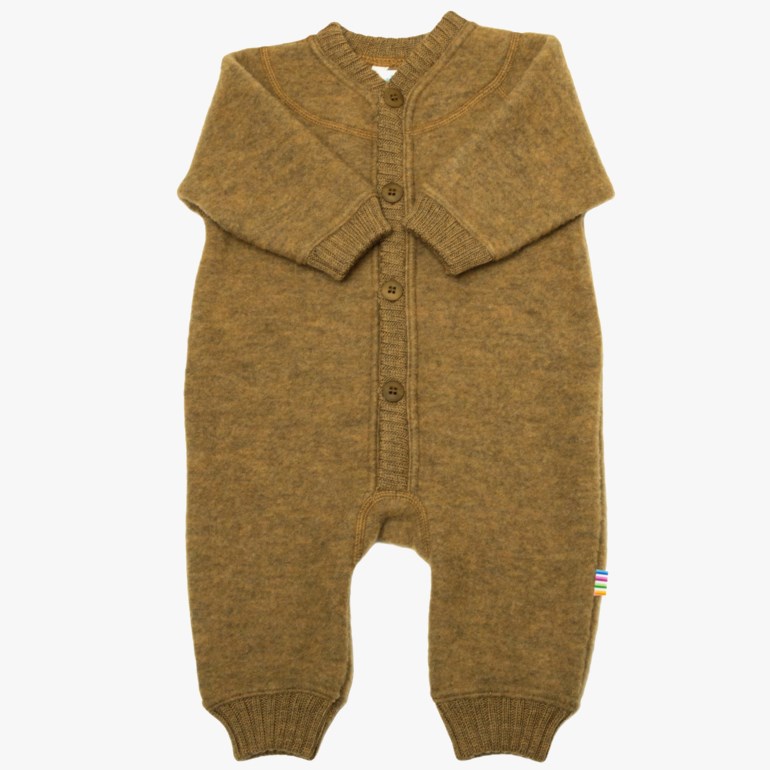 Heldrakt som lukkes foran med knapper. Ribbestrikket halsringning, knappelukking, ermer og ben. En kraftig børstet ullkvalitet som er ekstra myk. Bruk drakten i bilsetet eller barnevognen. Ensfarget. Ren merinoull og merket Oeko-tex 100.
