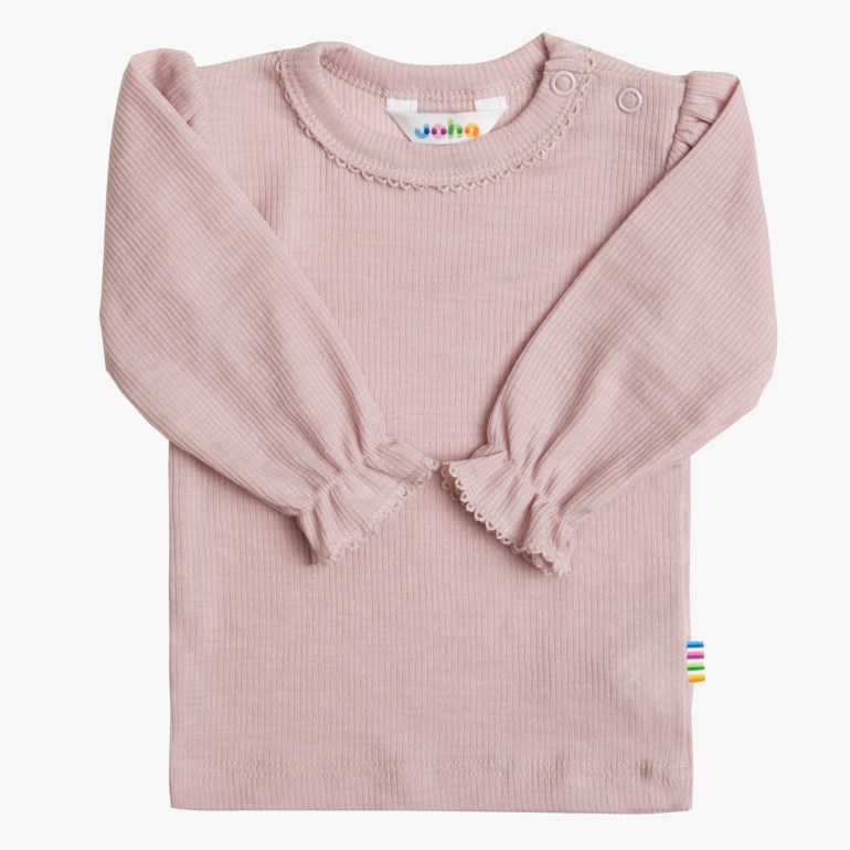 Bluse med lange ermer. Str. 60-90 har trykknapp på en skulder for lettere av og på kledning av de små. Piquette søm i nakke og ermer, samt rynke effekt på håndleddet som søte detaljer. En ekstra fin ullkvalitet med silke. Utrolig myk og med et litt skinnende uttrykk gjør denne kvaliteten ekstra fin og deilig. Ensfarget i en ullrik blanding.
