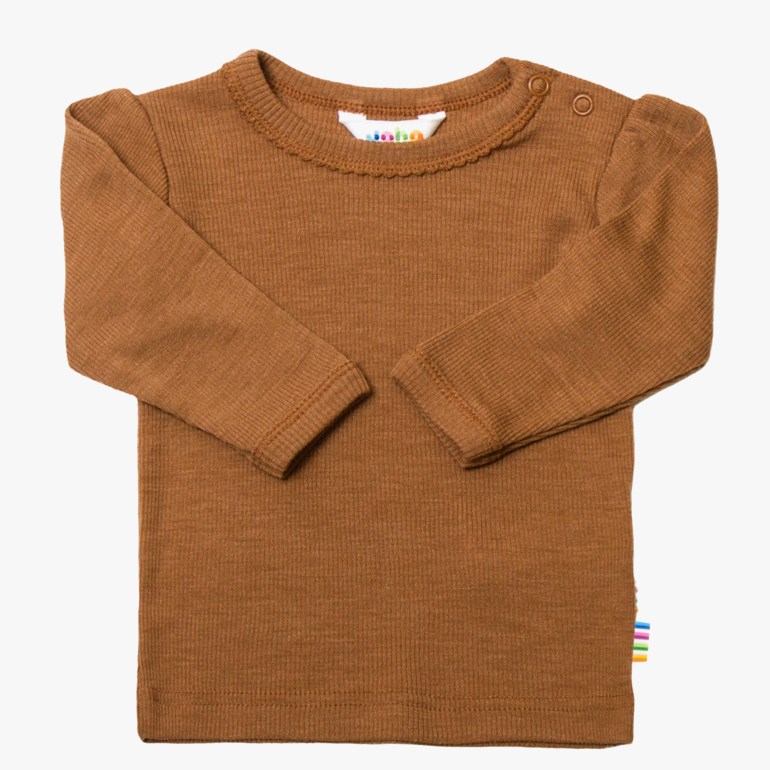 Bluse med lange ermer. Str. 60-90 har trykknapper på den ene skulderen for lettere påkledning av de små. Søt piguette rundt halsen og puffermer som fine detaljer. En ekstra fin ullkvalitet med silke. Utrolig mykt og med et litt skinnende uttrykk gjør denne kvaliteten ekstra fin og deilig. Fin farge. Ullrik blanding og merket Oeko-tex 100.