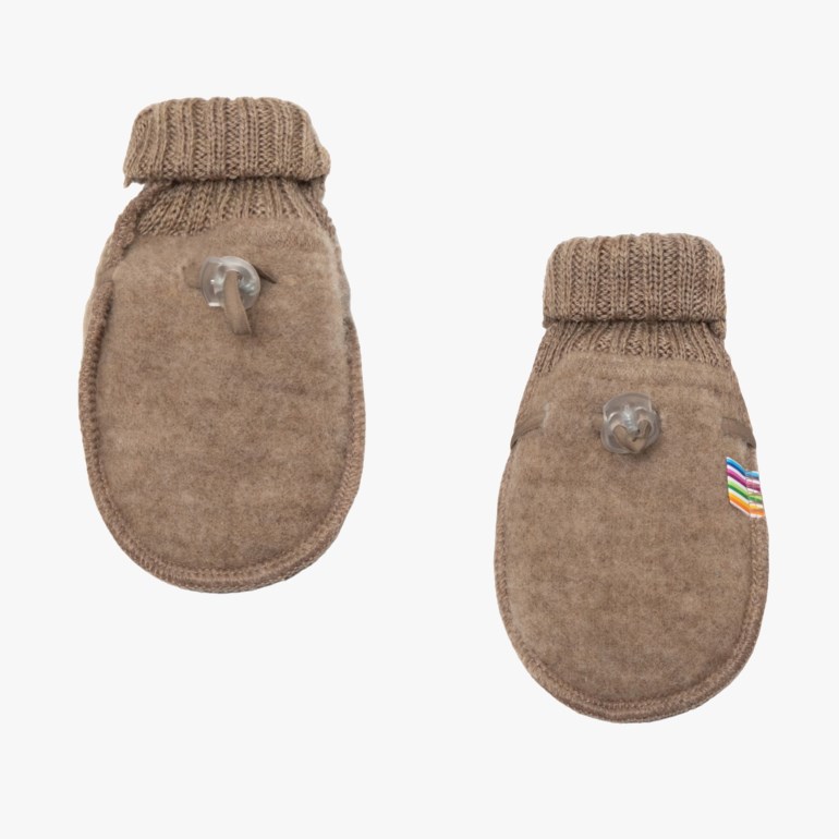 Baby hansker uten tommel. Har vrangbord og blondestopper ved håndleddene slik at de ikke faller av. en sterkere børstet ullkvalitet som er ekstra myk og deilig. Ensfarget. Ren merinoull og Oeko-tex 100 etikett.