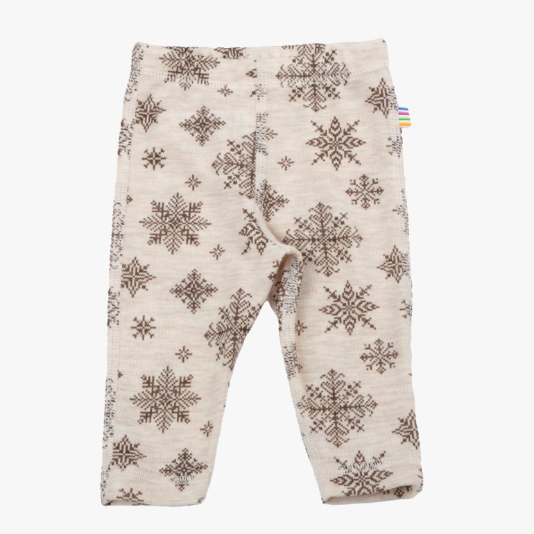 Ull leggings med god strikk i midjen. En ribbet, myk og lett ullkvalitet med god strekkbarhet som er veldig behagelig å ha på. Fint snøfnuggtrykk. Ren merinoull og Oeko-tex 100 etikett.