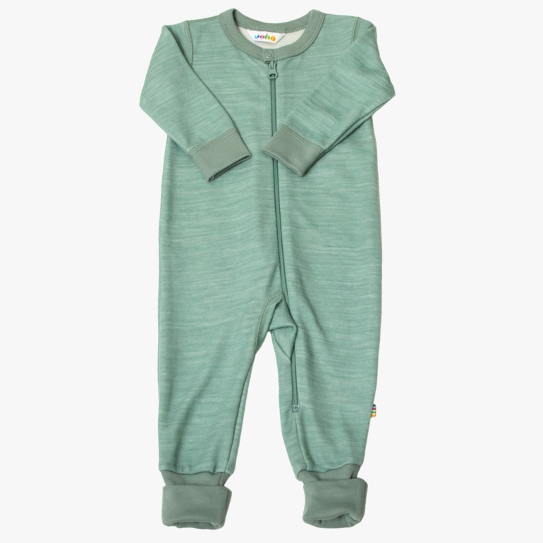 Heldress med 2 i 1 fot. Lukkes med trykknapp og glidelås som går ned på det ene benet for enklere påkledning. En deilig myk og elastisk kvalitet, hvor ullens unike egenskaper er på utsiden og myk økologisk bambus på innsiden. Spesielt egnet for svært sensitiv hud. Ensfarget. Ullrik blanding og Øko-tex 100 etikett.