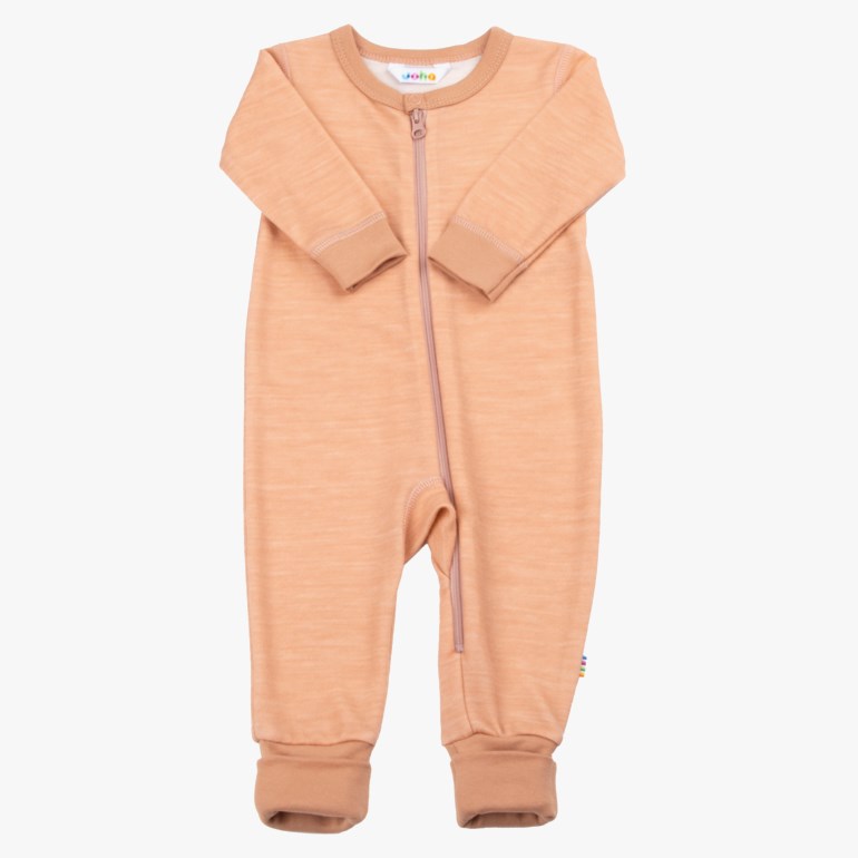 Ull/bambus heldress med 2 i 1 fot. Lukkes med trykknapp og glidelås som går ned på det ene benet for enklere påkledning. En deilig myk og elastisk kvalitet, hvor ullens unike egenskaper er på utsiden og myk økologisk bambus på innsiden. Spesielt egnet for svært sensitiv hud. Ensfarget ullrik blanding og Oeko-tex 100 etikett.