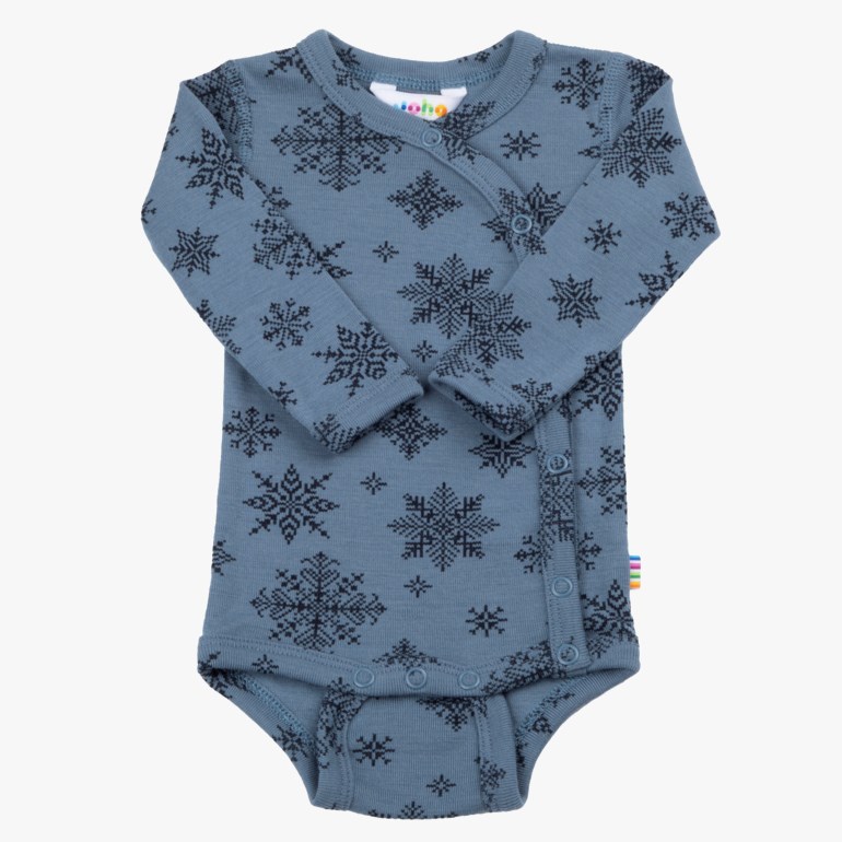 Body med lange ermer og sidelukking for de minste. Trykknapper diagonalt over magen og mellom bena for enklere påkledning. En ribbet, myk og lett ullkvalitet med god strekkbarhet som er fantastisk behagelig å bruke innvendig. Fint snøfnuggtrykk. Ren merinoull og Oeko-tex 100 etikett.
