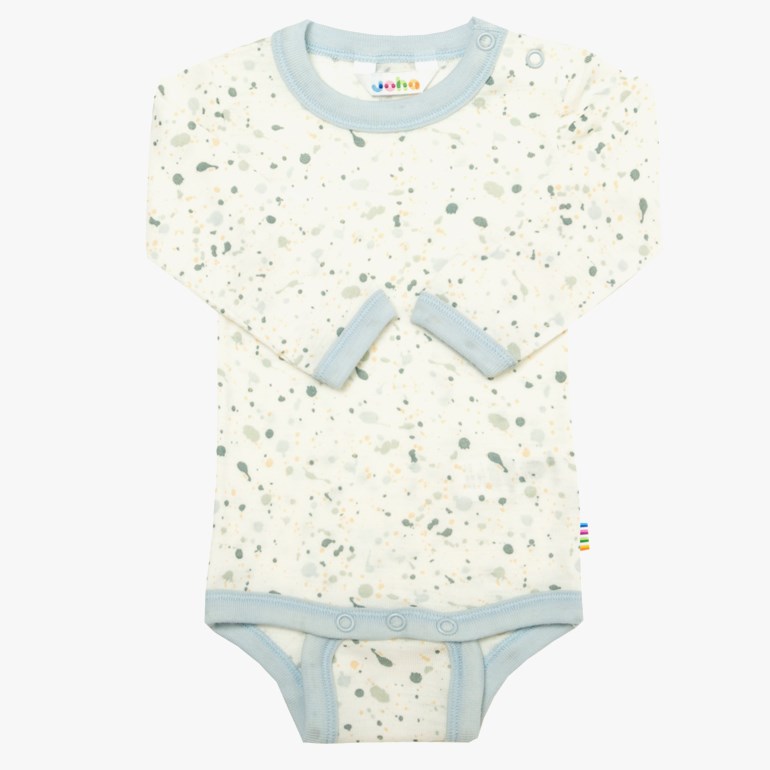 Body med lange ermer. Trykknapper på den ene skulderen samt mellom benene for lettere påkledning. En myk og lett ullkvalitet med god strekkevne som er deilig behagelig å bruke innerst. Søtt print med kontrastfargede kanter. Pure merino wool og Oeko-tex 100 merket.