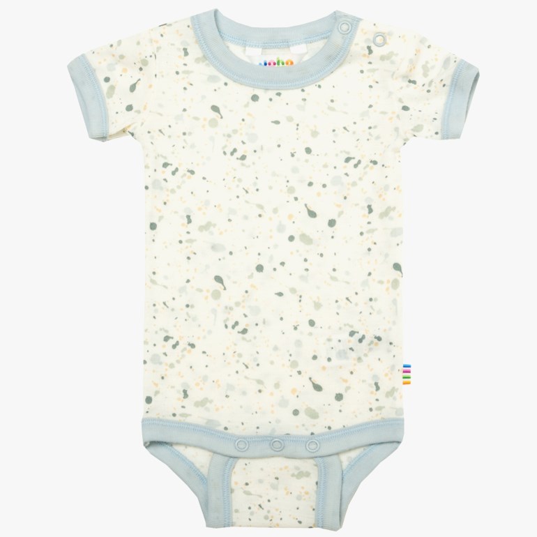 Body med korte ermer. Trykknapper på den ene skulderen samt mellem bena for lettere påkledning. En ribbet, myk og lett ullkvalitet med god strekkevne som er deilig behagelig å bruke innerst. Søtt print med kontrastfargede kanter. Pure merino wool og Oeko-tex 100 merket.