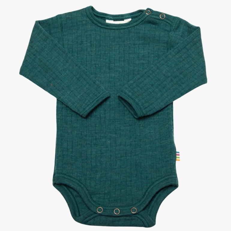 Body med lange ermer. Trykknapper på den ene skulderen og mellom bena. Virkelig en myk, elastisk lett ullkvalitet med vertikalt sporemønster. Tøybarheten til kvaliteten gjør den behagelig å bruke på innsiden. Ensfarget. Ren merinoull og merket Oeko-tex 100.