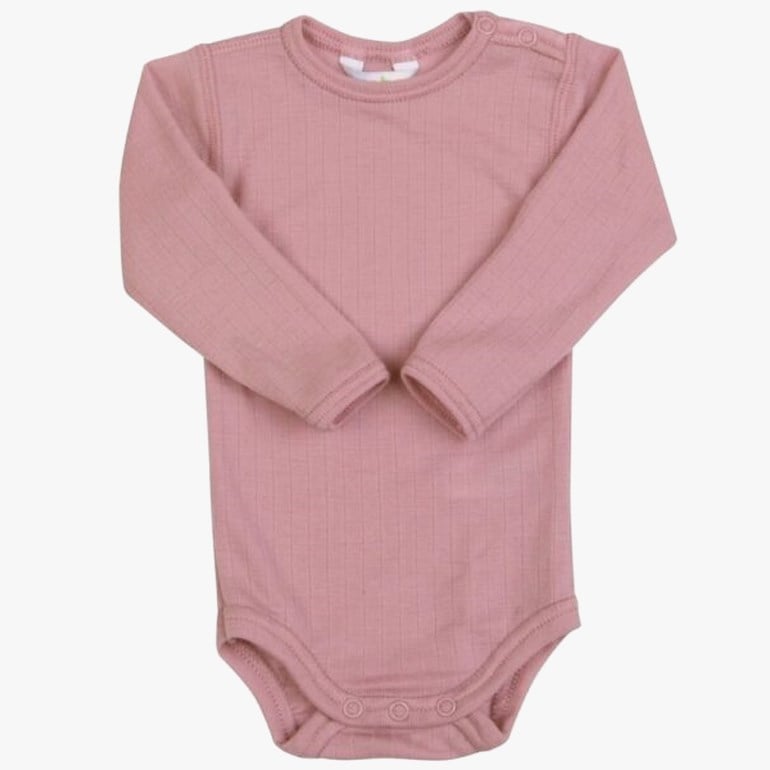 Body med lange ermer og trykkknapper på den ene skulderen og mellom bena. Virkelig en myk, stretchy lett ullkvalitet med vertikalt ribbemønster. Strekkbarheten i kvaliteten gjør den behagelig å bruke inne. Ensfarget. Ren merinoull og Oeko-tex 100 etikett.