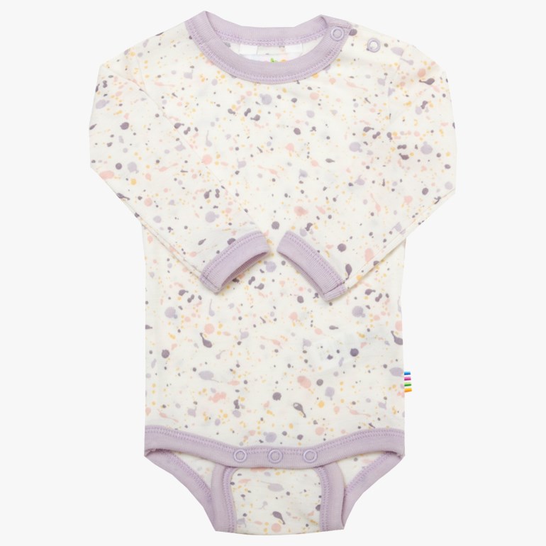 Body med lange ermer. Trykknapper på den ene skulderen samt mellom benene for lettere påkledning. En myk og lett ullkvalitet med god strekkevne som er deilig behagelig å bruke innerst. Søtt print med kontrastfargede kanter. Pure merino wool og Oeko-tex 100 merket.