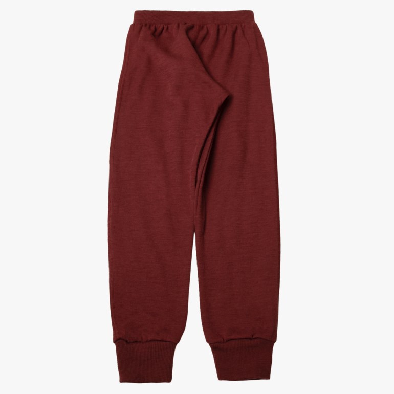 Ribbekantet bukse med god strikk og knyting i midjen. Bred ribbet kant i bena som kan brettes opp eller ned etter behov. Laget i en lett og deilig børstet ullkvalitet, som er super å bruke i bilsetet eller barnevognen.