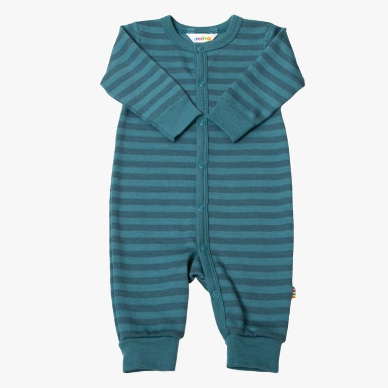 Heldress i ull som lukkes med trykknapper helt ned langs det ene benet. Laget i en fin, glatt og elastisk ullkvalitet som er deilig og myk og behagelig å ha på. Dekorert med fine striper.