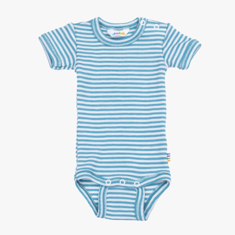 Denne kortermede bodyen er laget av en eksklusiv blanding av ull og silke, noe som gir en myk og lett følelse mot huden. Stoffet har en naturlig glans og sørger for temperaturregulering året rundt. Trykknapper på skulderen og mellom bena gjør påkledningen enkel.