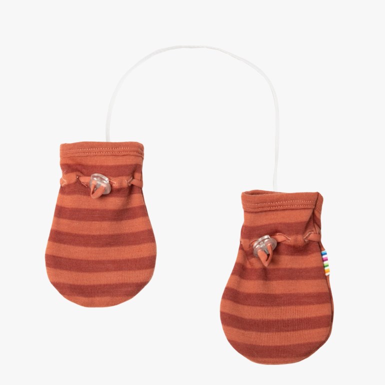 Fine, stripete og dobbellags votter uten tommel fra Joha. Vottene har snøre på håndleddene så de ikke faller av, og kommer også med tråd som kan tres gjennom dress/jakke. Laget i en fin, glatt og elastisk ullkvalitet som er deilig og myk og behagelig å ha på.