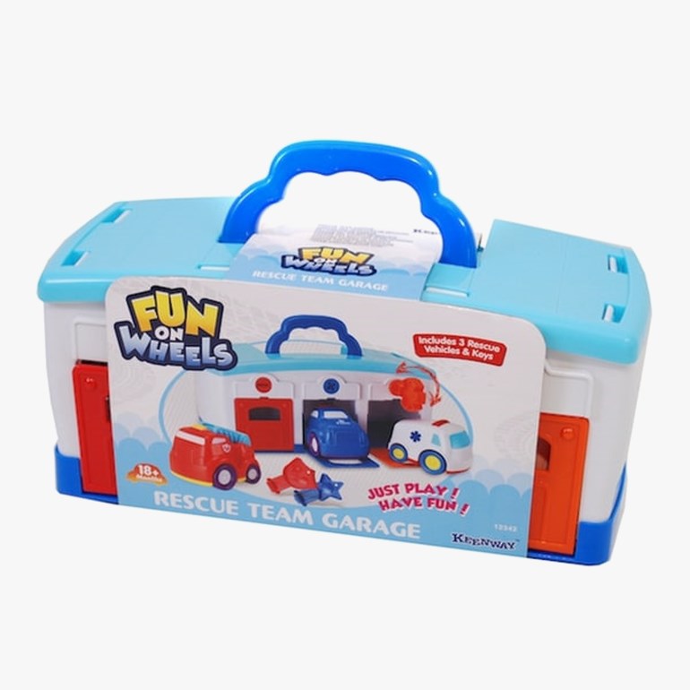 Fargerik garasje som inkluderer en politibil, en ambulanse og en brannbil. Portene åpnes med tre ulike nøkler som følger med, slik at bilene kan parkeres. Garasjen har håndtak og er enkel å bære med seg.