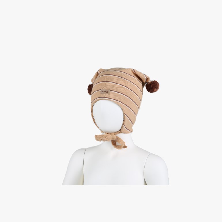 Kivat lue med knyting, perfekt til bruk vår og høst. Luen er laget i økologisk bomull og har vindstopper over ørene og søte dusker. Kivat-logo i front.