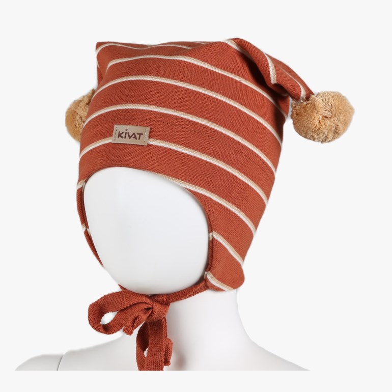 Kivat knytelue i økologisk bomull med vindstopper, smalstripete med KIVAT logo.