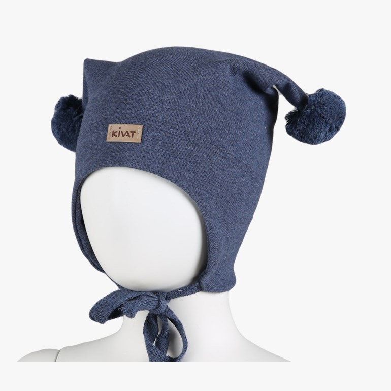 Kivat knytelue i økologisk bomull med vindstopper og KIVAT logo. Klassisk design med to dusker og knyting under haken.