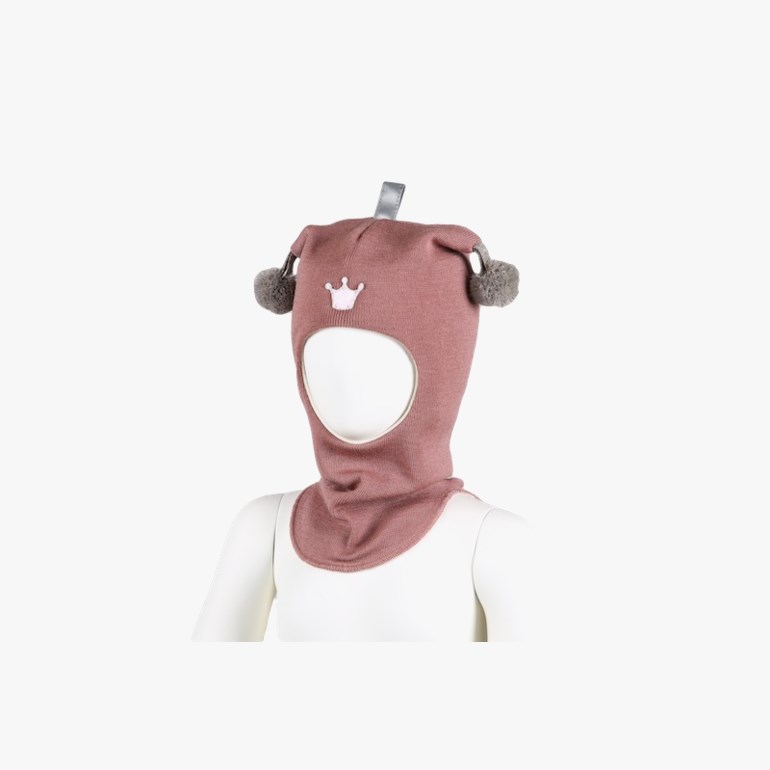 Kivat hettelue ensfarget med dusker og krone, fôret med økologisk bomull og med vindstopper.