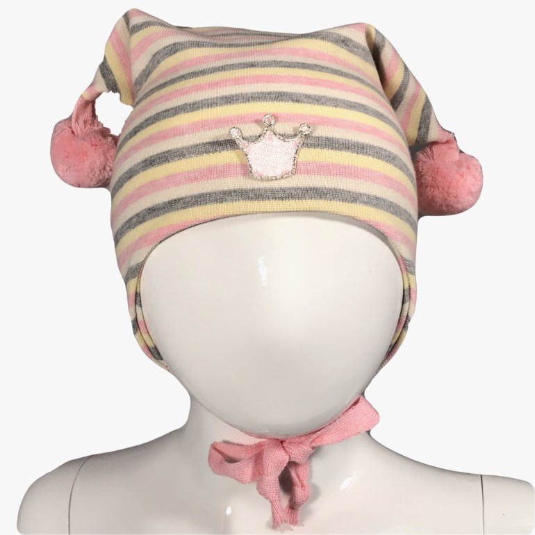 Kivat knyttelue m/vindstopper i myk økologisk bomull, stripete rosa/lysrosa m/krone. Knyttelue størrelseguide: 1 G: 1 år 2 G: 2-4 år 3 G: 5-10 år