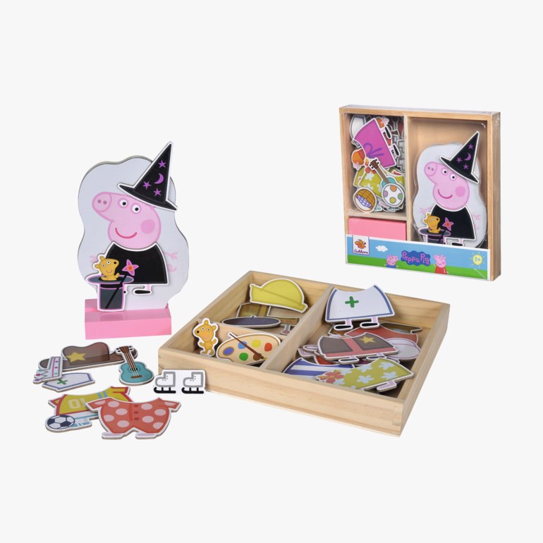 Peppa Gris puslespill - kle Peppa Gris i forskjellige antrekk ved hjelp av magnetiske plagg og tilbehør. Oppbevaringsboks i FSC®-merket tre er inkludert.