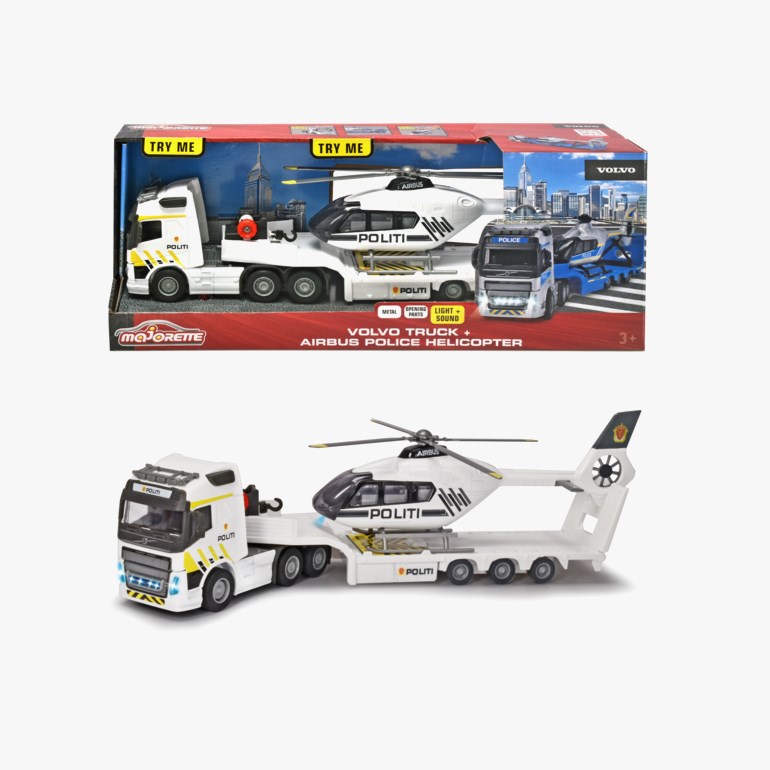 Denne Volvo FH-16 polititraileren kommer med et politihelikopter på lasteplanet og de har begge mange praktiske funksjoner. Lastebilen og Airbus H135-helikopteret har to forskjellige lys- og lydeffekter. Helikopteret har også roterende, utfellbare rotorblader for enda mer moro lek! Tilhengeren har en slepevinsj med tau og krok, som gjør at du kan sikre helikopteret på plass under transport.