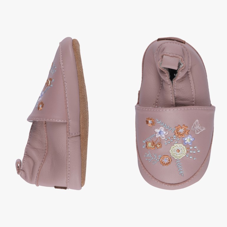 Søt skinntøffel med frottéfôr, semsket skinnsåle og de fineste detaljen øverst. Den praktiske elastiske kanten holder skoen på plass og gir komfort for den lille.
