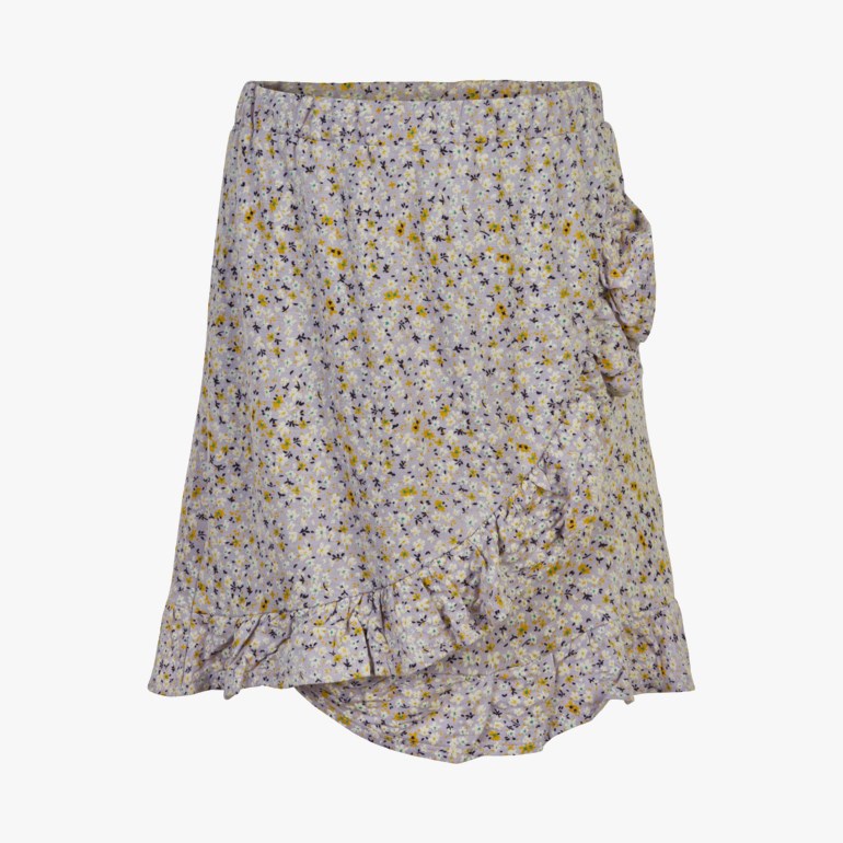 Søtt småblomstrete skjørt med omslageffekt i myk bambusviskose. Skjørtet har fine rysjer på forsiden og rundt kanten nederst. Med elastikk i livet får det en god passform. Kommer i str. 92-128 i farge lyslilla. Det er laget av 95 prosent bambus viscose og 5 prosent elastane som gir skjørtet en myk og fleksibel passform som er god mot huden.