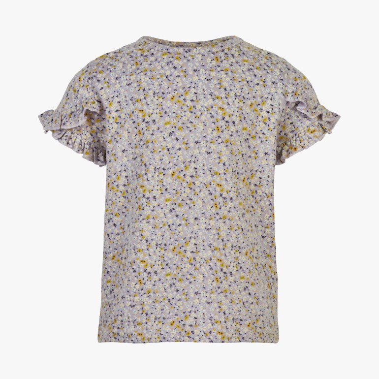 Fin småblomstrete T-shirt med kort erm og rysjer nederst på ermene. T-shirten er i myk bambusviskose og veldig behagelig å ha på. Kommer i str.92-128 I farge lyslilla. Den er laget av 95 prosent bambus viscose og 5 prosent elastane som gjør den supermyk og god mot huden.
